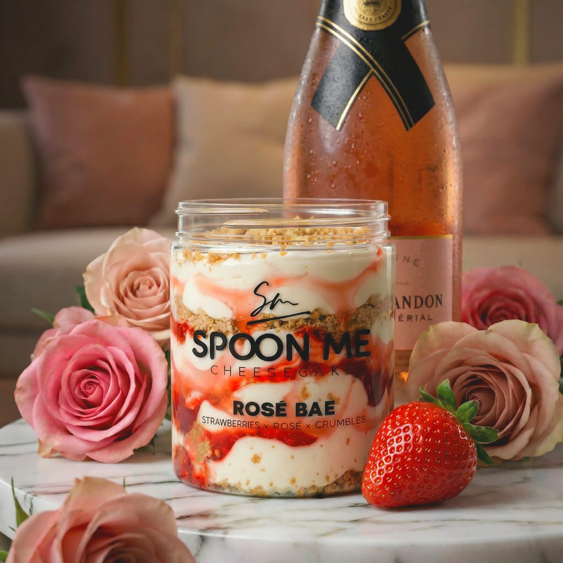 Rosé Bae Cheesecake is swirled with lush rosé ribbons and fresh strawberry ribbons, layered over our classic cheesecake base, and finished with a sprinkles of golden crumbles. She’s elegant, indulgent, and just a touch flirtatious—luxury with a playful twist.